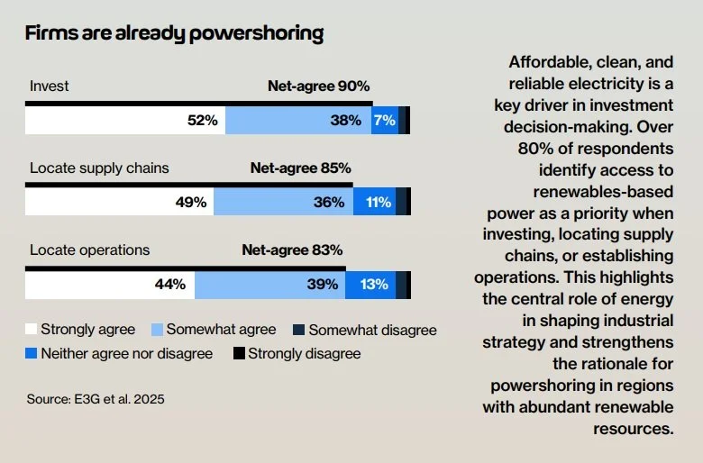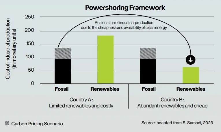 Based on the concept first formulated by Arbache and Esteves (2023), powershoring refers to the strategic relocation of energy- and resource-intensive industrial activities to regions that combine access to abundant, low-cost clean energy with proximity to key natural inputs. Unlike traditional offshoring — driven by cheap labour — powershoring is driven by the growing competitive advantage of clean, affordable electricity as a foundational input for modern industrial production.